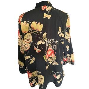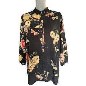 CITRON Santa Monica 100% Silk Asian Floral Lotus Print Blouse Top XL Black