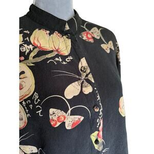 Elegant 100% silk Citron Santa Monica button-front blouse featuring a black base with Asian-inspired lotus flowers, butterflies, and calligraphy for a timeless, art-to-wear look.