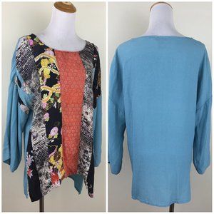 CITRON Textured Blue Multi-Color Patchwork Print 100% Silk Long Sleeve Shirt