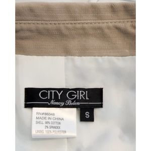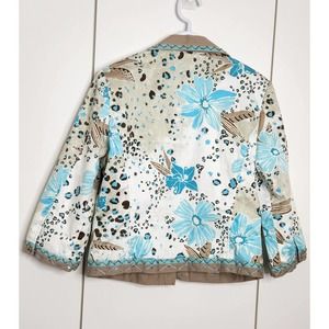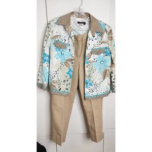 Whie, beige, and blue. Beaded on the pockets, cuffs, collar and cuffs. 98%cotton. Nice big buttons close in front and pockets. Slightly padded shoulders. Fully lined in white. Sleeves are 18 3/8" long. 22" from shoulder seam to bottom is 22". Shouldder seam to shoulder seam is 15".
