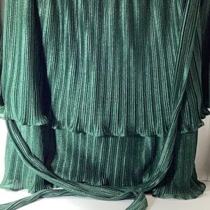 • Allover pleats; self-tie sash at waist; ruffled tiered skirt