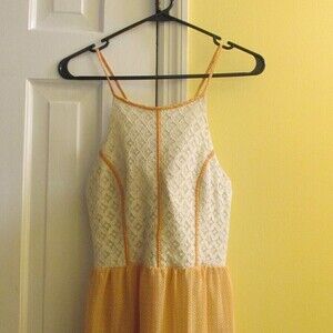 THIS BEAUTIFUL JUNIORS DRESS IS ADORNED WITH LOTS OF LACE OVERLAY ON TOP WITH A BUILT IN BRA/PADDING. LONG SILKY, FLOWING BOTTOM PORTION HAS A SLIP BUILT IN TO ABOUT THE KNEES, AND A LONG SPLIT ON THE SIDES. ZIPS UP IN BACK WITH A HOOK AND EYE CLOSURE.