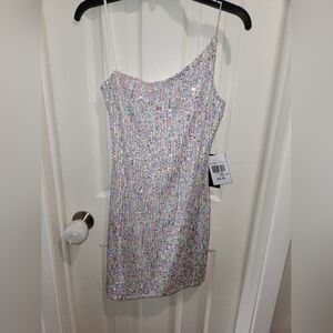CITY Vibe One-Shoulder Rainbow Sequin-Embellished Asymmetric Hem Sheath Dress