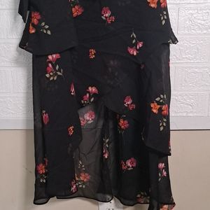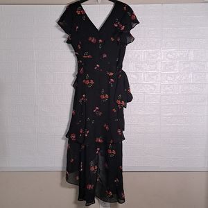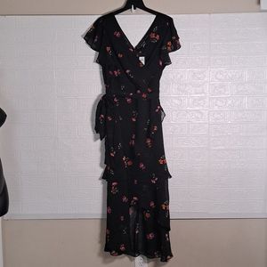This Bloom Floral Wrap Maxi Dress by CITY CHIC is a classic style you’ll reach for time after time. Whether you’re heading into the city, to the beach, or for a catch-up with friends, this black number makes for a staple piece to rely on in your arsenal. Made with 100% chiffon, this charming dress is adorned with romantic flowers all over. It has a surplice V-neckline, flutter cap sleeves, wrap-style front with self-tie, lining, tiered skirt, midi length front, Maxi back length, and hidden back zip.