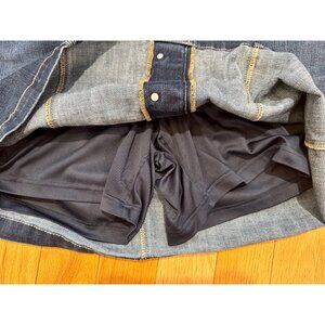 Classic and versatile 💙 This dark blue denim skirt features tan contrast stitching, a full button-down front, and functional pockets at both the sides and back. Knee length and easy to dress up or down—pair it with boots, sandals, or sneakers for effortless style.