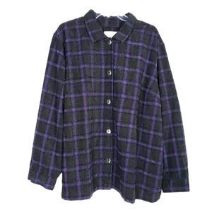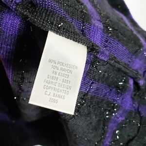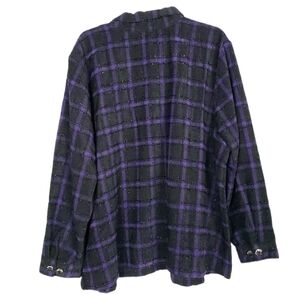 C.J. Banks black and purple plaid button down shirt with black shimmer threads. Fun buttons. Heavy enough weight to also be worn as a shacket. from 2000s. Awesome colors for Halloween and fall!
