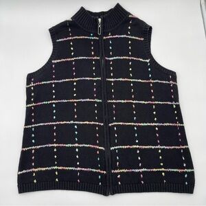 CJ Banks Christopher & Banks 1X Hand Embroidered Zip up Cardigan Sweater Vest Black Pastel Ramie. Item is in good pre-owned condition. May show signs of general wear. Please see photos for full details of condition. Any size measurements shown are approximate. Smoke free, pet friendly home. Colors may vary slightly based on lighting.