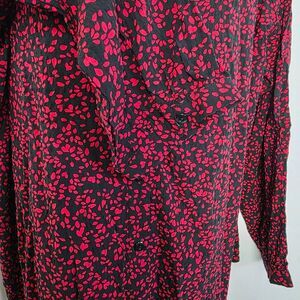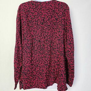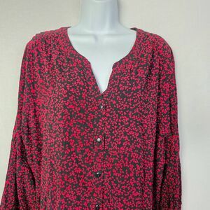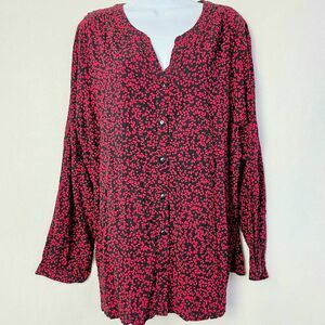 CJ Banks women’s blouse, size 2X. Black with red floral print, v-neckline, button front, and long sleeves with gathered cuffs. Made from rayon-spandex blend for comfort and easy drape. Great for office or casual wear.