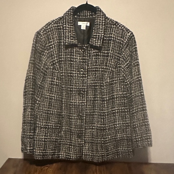 Elegant tweed blazer with a classic design. Perfect for both office and casual settings. Features a button-up front.