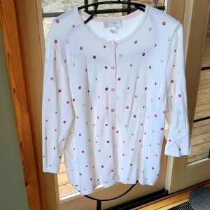 EUC...Charming white cardigan featuring colorful polka dots. Perfect for adding a playful touch to any outfit. Check out all pics for details and approximate measurements.