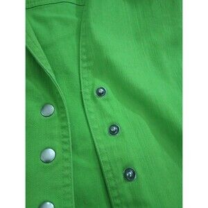 This is a CJ Banks By Christopher & Banks women's jacket in size 1X. It is a green twill jacket with a button closure, 3/4 sleeves, and a short length. The jacket features a stretchy fabric, making it comfortable to wear. Suitable for various occasions like travel, parties, casual outings, workwear, and business settings. The design is a basic style with colorful accents and no lining.