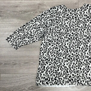 CJ Banks Cardigan Sweater Leopard Print 3/4 Sleeve in size 1X. Excellent preowned condition. Button front, ribbed cuffs and hem, white, back and gray print. Please see photos for approximate measurements and details. Item may show difference in color based upon photography and perception. Photos are part of the description, as everyone’s level of condition may vary. From smoke free and pet free home. All packages are shipped the same or next business day.