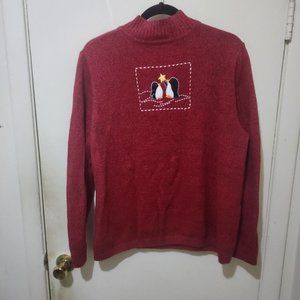 CJ Banks Christmas/Winter sweater. red/black/white. size 1X. has deer/penguins/polar bear. 1/4 zip. hand embroidered. has penguins on the back. 55% ramie 45% cotton. hand wash cold inside out and dry flat. smoke free home.