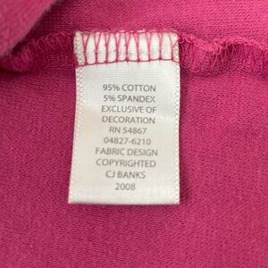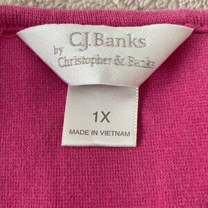 Colorful presents spell out PEACE on this bright pink t-shirt. From CJ Banks, it's a size 1X and measures 24 inches across the front.