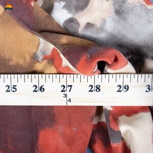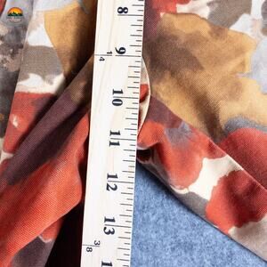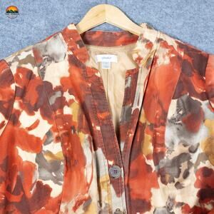 This CJ Banks jacket for women is a multicolor, floral or abstract pattern in shades of brown, orange, and tan. It is a long-sleeve jacket with a collared neckline and a three-button front closure. The jacket also has two front pockets.