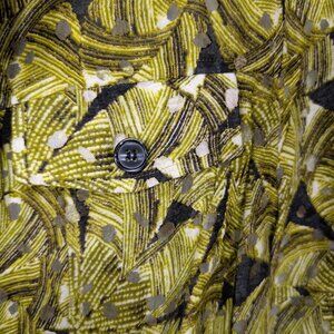 Stylish button-up shirt with a vibrant leaf pattern. Features a mix of green and black colors.