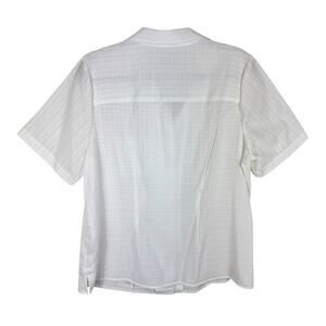 NWT. White short sleeve collared lightweight button up blouse. Fabric is embroidered in a checkered pattern with white thread. Has open pocket on left chest. Rayon/polyester material. Approx. measurements: Shoulder to hem 27", pit to pit 22". Size X (14W).