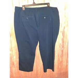 The CJ Banks Navy Taper Pants in size 22W are stylish dress pants designed for women. Made from a blended fabric of polyester, spandex, and cotton, these pants feature a mid-rise waist with a flat front and tapered leg silhouette. The pants are machine washable and have pockets, making them practical for various occasions such as travel, casual outings, and business meetings. The solid navy blue color and timeless classic theme make these pants versatile for year-round wear.