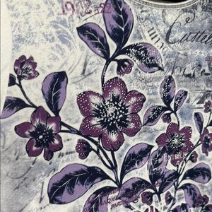 Add a touch of romance to your wardrobe with this CJ Banks tee featuring a vintage-inspired script background and bold purple floral design accented with rhinestones. With 3/4 sleeves and soft cotton fabric, this top blends comfort with Parisian flair.