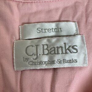 This pink jacket from C.J. Banks combines comfort and style. Its stretch cotton material offers ease of movement, making it suitable for casual outings.