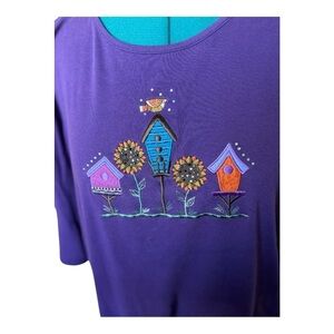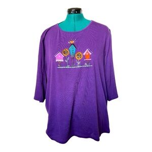 CJ Banks Purple 3/4 Sleeve Tee with Embroidered Birdhouse Design