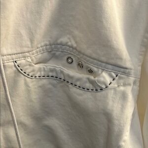 This stylish women’s jacket features a comfortable hood and a sleek white design. 100% Cotton.