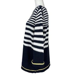 CJ Banks women's size 1X knit sweater, it has a bandeau neckline, blue, white and yellow stripes, 3/4 sleeves, lightweight fabric, stretchy, mid-length, nautical theme, rolled cuff and soft. Materials 100% cotton. Care machine wash cold tumble dry low. Condition is preloved good as shown in pictures. Please preview the measurements to ensure fit.