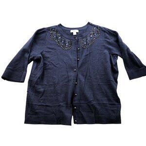 CJ Banks Womens Cardigan Sweater Size 2X Button Up Embellish Navy Blue Retro
