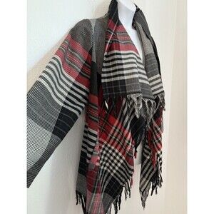 Elevate your wardrobe with this stunning CJ Banks women's jacket in a vibrant red black white patchwork plaid pattern. The mid-length jacket features long sleeves, fringe accents, and pockets to create a bohemian and classic look perfect for any occasion. The jacket is made of a wool blend twill fabric that is machine washable for easy care.
