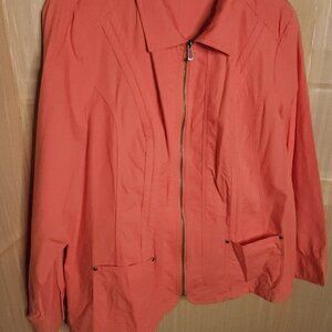 CJ Banks women’s plus salmon pink full zip jacket 2X. Good condition. Measurements are: 24” sleeve, 28” from shoulder to hem, and 26” from armpit to armpit.