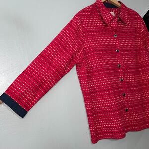 CJ Banks button front red, navy blue, and white overshirt / shacket in Excellent pre-owned condition! NOTE: the button has been removed, sleeve cuffed and then sewn together with button. (see photos) Could easily be returned to normal, but is very functional as is.