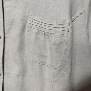 CJ Banks women's oatmeal colored short sleeve button up shirt. Pleat detail at the sleeves and pockets. Mother of pearl buttons. 55% linen, 45% rayon.