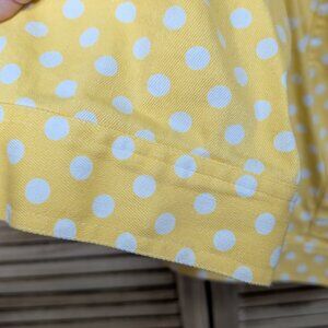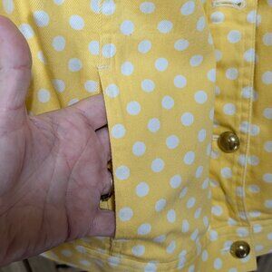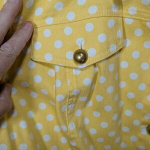 Stylish yellow jacket with white polka dots. Features button closure and front pockets.