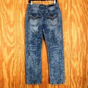Features: Relaxed fit through the seat and thigh, straight leg opening, classic 5-pocket design, unique acid wash pattern.