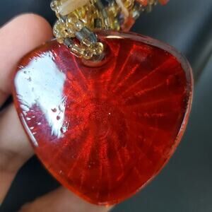 This CJ necklace is a stunning piece that features multilayered strands of glass beads, giving it a sophisticated and stylish look. The pendant boasts a unique resin swirl design with a textured finish, adding an artistic flair to the accessory. Measurements are included in the pictures for reference.