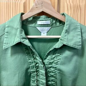 This shirt is a bit warmer and has more yellow undertones than the picture conveys. Beautiful condition, flattering stretch fabric. Short sleeves with button, ruffle detail on front. Size 3 X