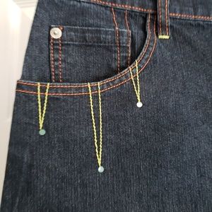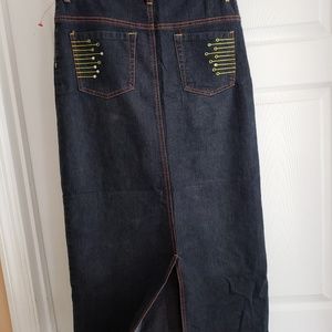 Pre-Owned Denim skirt size 8. It is missing the button. Otherwise in nice condition. Please see photos. Hopefully someone can fix the button and have much enjoyment out of this skirt. Plese see photos. Questions welcomed.