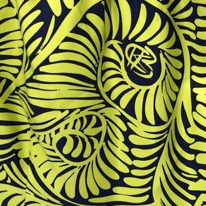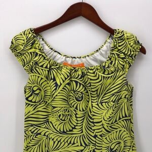 Silk off the shoulder dress in a tropical spiral leaf print in greens and blues from CK Bradley. Size 2. Used condition. Please see photos.