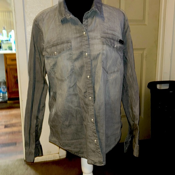 Gray acid wash button down with pearl snap closures. You can dress this up or just wear casual. Soft fabric with great stretch. Runs a little smaller, fits like a large.