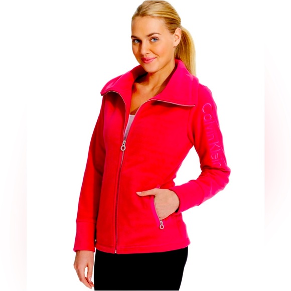 Bright red fleece jacket with branding on left sleeve. Has outer and inner pockets. Excellent condition!