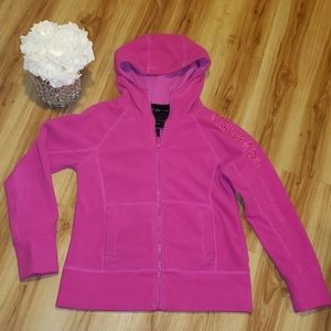 Fascia colored fleece. 100% polyester with cute earphone and cellphone pockets. Left pocket is a little lose. Otherwise it's in good condition. Make me an offer!