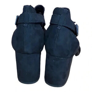 CL by Laundry Joanne Heeled Suede Sandals, black with floral cutouts, block heel, adjustable strap, peep toe, size 8.5.