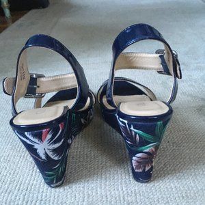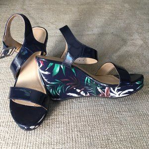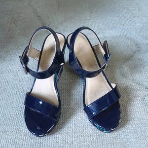 -- Adorable palm leaf wedge platform sandals with patent navy straps in almost-new condition