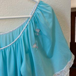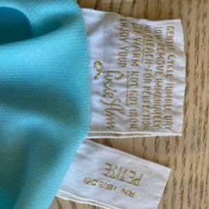 • Bell Sleeves; Size Petite/Small; Pretty Seafoam Blue, 100% Nylon, with signature embroidered tulip flowers on left sleeve and lace trim