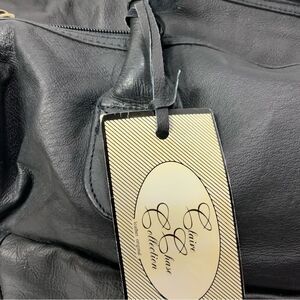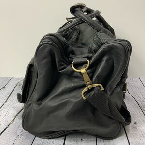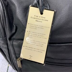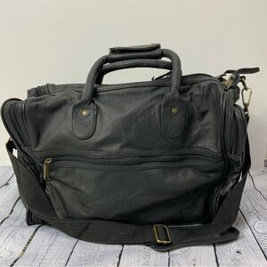 Mens NWT Claire Chase Genuine black leather duffel bag. 2 side zipper compartments, perfect for shoes, large inside compartment, front flap with zipper pocket opens to and open pocket, back zipper compartment, double top handles and long adjustable strap.