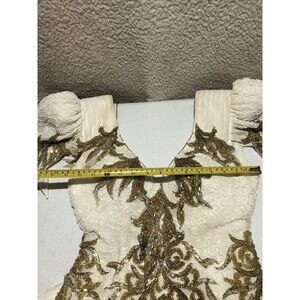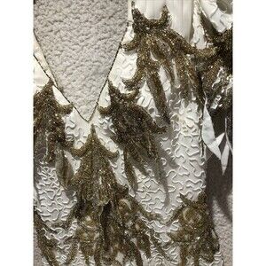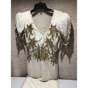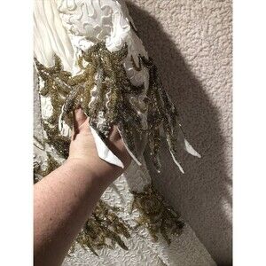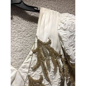 The tag does not have a size. This dress is heavy. All beads look great. Dress has discoloration thru out dress such as shoulders and bottom section. Dress definetely is older and needs a dry cleaning which should lift all the discoloration out of dress. Dress would fit for a pageant or wedding. Discoloration spots are throughout the dress and some spots may not be seen to be mentioned. Please go thru pictures.