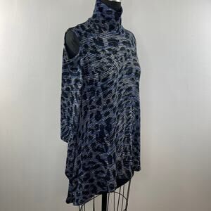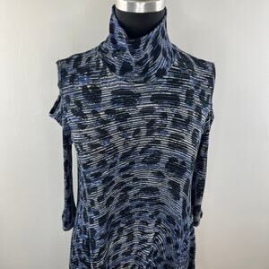 CLARA SUN WOO Blue Black XS Cold Shoulder Top Turtleneck 3/4 Sleeve Pullover