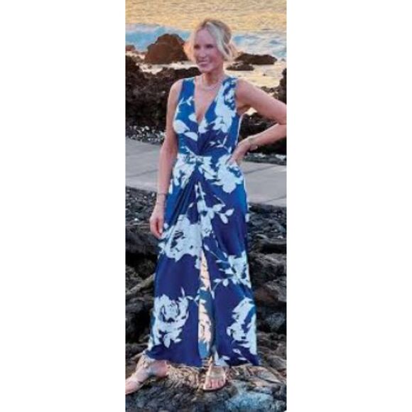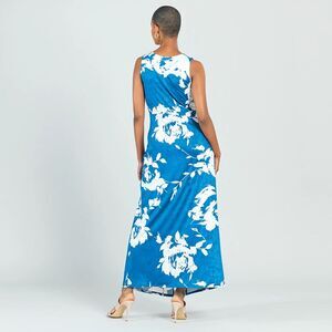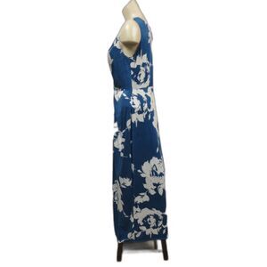 CLARA SUN WOO Crushed Silk Knit Center Slit Maxi Dress Sz M 12 Blue White Floral