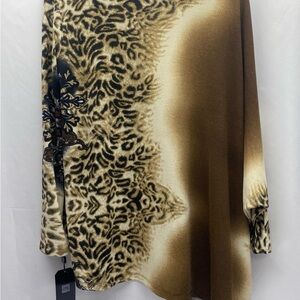 Stylish animal print tunic. Features a blend of brown and cream tones. Perfect for a chic look.