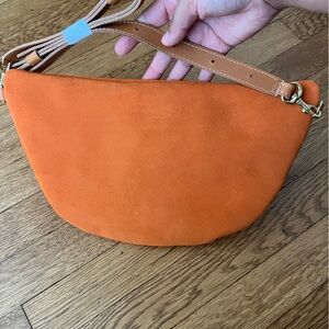 Chic and stylish orange suede bag perfect for any occasion. Features a sleek design with a comfortable strap for easy carrying. Grande Fanny bag by Clare v. Brand new. She goes everywhere